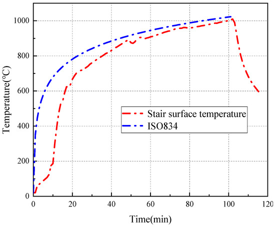 The stairs were lifted into the test furnace with a lifting belt and fixed on the support, and the stair installation was completed as shown in Figure 8. The test furnace used for the temperature rise test is a horizontal fire test furnace, with an internal size of 3000 mm × 4000 mm × 1500 mm. The heating device consists of an experimental furnace, a control room, a gas supply system, and an ignition system. The horizontal furnace has a total of 6 nozzles, distributed on both sides of the inner wall, to ensure uniform fire on all four sides of the specimen. When heated, natural gas is mixed with air and burned to heat up the open flame. The heating system is controlled by a computer, and both gas supply and combustion being fully automatic. The experimental device is shown in Figure 9. After the stair specimens were installed, the furnace was covered, the fan was started, and the main air valve was opened to purge the furnace for 15 min. Then, the igniter was opened for ignition to allow for open-flame burning in the furnace. During the heating period, external phenomena such as sound, water vapor, and temperature at each measuring point were recorded continuously. The temperature rise is different from the ISO834 curve because the furnace is heated by open-flame combustion. Therefore, a temperature measuring point was arranged on the surface of the unribbed set of stairs to record the temperature change of the whole process and compare it with the ISO834 curve, as shown in Figure 10. The heating time of the stair specimen in the testing furnace was about 100 min, and then the temperature began to decrease. Due to limited conditions, the natural cooling method was used to cool the specimen after the heating was completed. After the stairs were restored to normal temperature, whether the stairs collapsed or not, as well as whether any cracks were created on the surface, was observed and recorded.