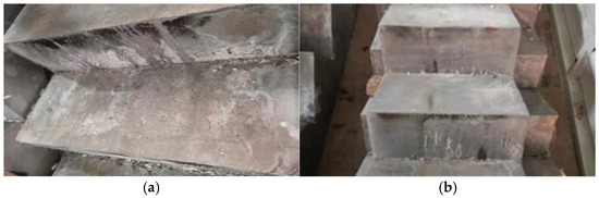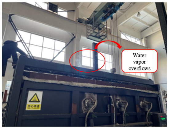 After about 20 min of the test, a large amount of water vapor was observed on the top of the furnace cover, as shown in Figure 11. According to the temperature curve of the experimental furnace in Figure 9, it can be observed that the temperature at the measuring point of the furnace slightly exceeds 600 °C at 20 min. However, there is a gradient in the temperature transfer process of the geopolymer stair as a concrete structure, so the internal temperature of the stair is below 600 °C at this time. The water in the geopolymer material consists of two parts: free water and bound water. At this time, a large amount of water vapor can be observed to overflow, and the analysis suggests that these water vapor sources are from the bound water in the geopolymers. The reasons for this are as follows: Firstly, the evaporation time of free water is lower than that of bound water. The evaporation time of free water is reached before 200 °C, and the evaporation time of bound water is reached after 200 °C. The phenomenon of water vapor overflow did not occur until 20 min after the experiment, and no such phenomenon was observed afterwards, indicating that these water vapors originate from bound water. The second reason is that the presence of water in the geopolymer is higher in the form of bound water than in the form of free water. Only this obvious water vapor overflow phenomenon was observed, indicating a higher content of this water vapor, which can also be analyzed as originating from bound water. The overall comparison of the stairs after the completion of the test is shown in Figure 12. And in the whole test process, the sound of high-temperature bursting phenomena of the test stairs were not heard.