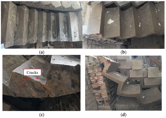Stairs can be a type of concrete structure, and the internal structure of the concrete will be damaged after being subjected to high-temperature fire, resulting in the deterioration of its mechanical properties, which is reflected in the incomplete structure and the decreased load-bearing capacity. Under the condition of high temperatures, the structure of ordinary concrete stairs will be deformed, cracked, and spalled, and could collapse in serious cases. However, although the two types of GHPC stairs in the experiment showed significant deformation, the main body of the stairs did not crack or spall. There may be two reasons for this. First of all, in the case of ordinary concrete, high-temperature heating seriously affects the chemical structure of hydration products such as calcium silicate hydrate (CSH) and calcium hydroxide (CH), while the chemical structure of the geopolymer is affected little by the dehydration reaction. At the same time, it is found that geopolymer concrete has more connecting pores [44], and the internal pore pressure accumulation is lower at a high temperature, and this does not easily lead to violent burst reactions. Secondly, the geopolymer will exhibit a sintering reaction or polymerization reaction at high temperatures. According to existing research findings showing that the geopolymer reaction at a high temperature will produce N-A-S-H gel, making the geopolymer structure more compact, sintering reactions can also cause micropores to collapse, and the bonding between particles continuously heals the cracks [22]. Geopolymer paste after high-temperature exposure has fewer voids and exhibits a smoother texture. The viscous sintering of the paste at a high temperature also leads to crack healing [33], and between 550 and 900 °C, the geopolymer gel sinters and viscous flow fills the pores [45]. In addition, after the high-temperature test, it could be clearly observed that the surface of the stair treads were penetrated with white paste, as shown in Figure 14. Therefore, it was suggested that the geopolymers inside the stairs underwent a reaction under the high temperature, and the resulting products filled the micro-cracks and voids inside the stairs. Due to these products filling them, cracks in the stairs at high temperatures did not appear, and only deformation was observed.
