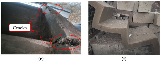 Diagram of appearance of GHPC stairs after test. (a) Top view of ribbed stairs; (b) top view of unribbed stairs; (c) side cracks on ribbed stairs; (d) rear view of unribbed stairs; (e) bottom cracks of ribbed stairs; (f) curved deformation of unribbed stairs.