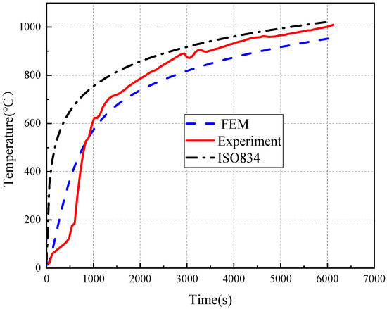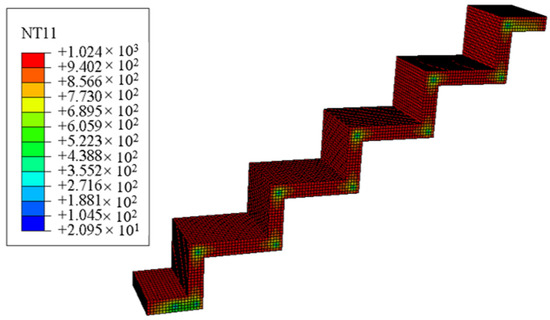 Firstly, the fire temperature field of the stair model was simulated. The temperature rise curve adopts the ISO834 standard temperature rise curve, and the temperature rise time was set to 100 min according to the test time. The simulated temperature field is shown in Figure 15. From the figure, it can be found that the temperature of the whole stair model almost exceeds 900 °C except for the concrete near the reinforcement part. A point on the fire surface of the stairs was selected to plot the increasing trend of the surface temperature of the stairs with time. The comparison between the temperature rise curve of the model and the temperature rise curve collected by the test is shown in Figure 16. It can be seen from the temperature rise curve that the simulation and the test agree well in terms of the temperature rise.