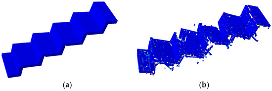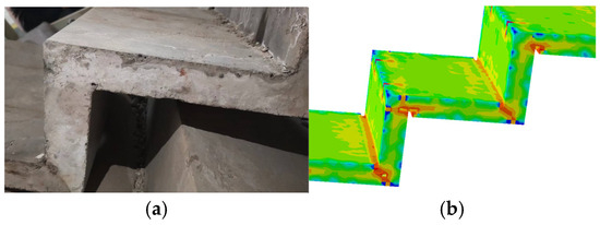 Comparison of simulated damage and experimental damage of GHPC stairs. (a) Experimental damage; (b) simulate damage.