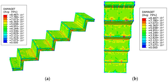 The simulated temperature field of the stairs was incorporated into the thermal stress analysis, where the material parameters for the GHPC and ordinary C30 concrete were set, respectively. Subsequently, the high-temperature damage conditions of both stairs under identical temperature fields were obtained. As depicted in Figure 17, the GHPC stair structure remained almost intact after exposure to high temperatures, while the entire structure of the ordinary C30 concrete collapsed and lost its bearing capacity entirely. To further investigate the damage conditions of the GHPC stairs, Figure 18 illustrates the tensile damage, compression damage, and stress distribution simulated by the GHPC stairs. DAMAGET and DAMAGEC in the legend represent the tensile damage and compression damage as a percentage of the degree of harm. The colors in this figure range from blue to red, indicating a gradual increase in the degree of destruction.