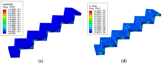 Simulation of damage in the GHPC stair model. (a) Tensile damage of the stairs; (b) tension damage at the base of the stairs; (c) compression damage of the stairs; (d) stress distribution in stairs (unit: MPa).