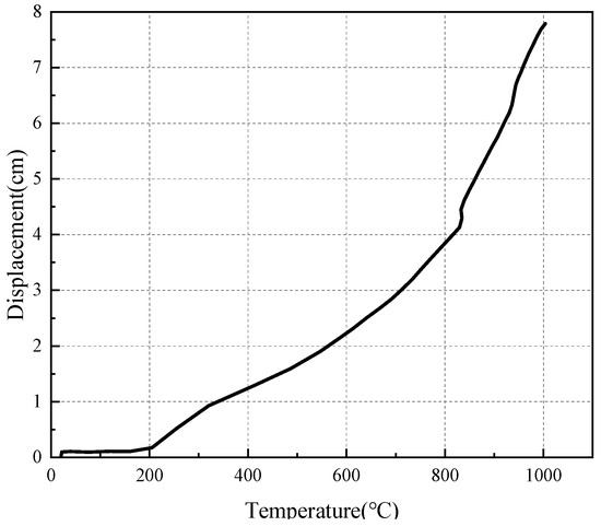 For the vertical deformation of the stairs, a point on the fire surface under the stair model was selected to plot the variation in the vertical displacement with the temperature, which is shown in Figure 20. From the plotted curve, it can be seen that there was almost no vertical deformation of the stair when the temperature was below 200 °C, and there was vertical deformation of the stair after 200 °C, and the deformation increased after the temperature reached 800 °C. Finally, the downward displacement of the stair model at this position reached 8 cm. The simulation result is lower than the test condition; however, it should be noted that the stairs undergo a cooling process in the test condition, leading to continued deformation at this stage. Additionally, it is important to consider that the simulation only performs calculations until the heating is complete. Therefore, based on the deformation of the stairs alone, we can conclude that there is consistency between the simulation and test results.