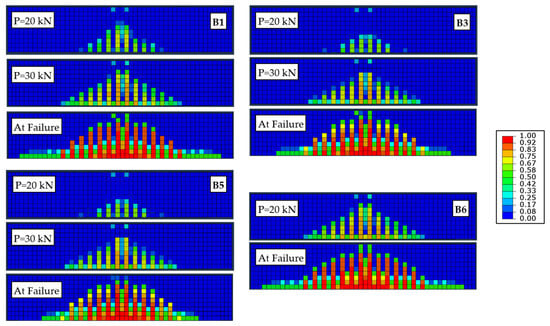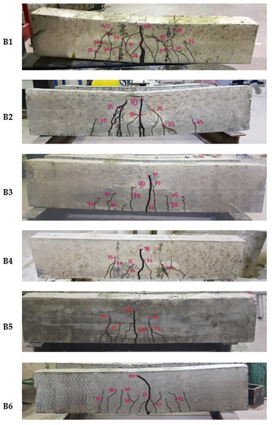 - The incorporation of LWC in the tension zones of RC beams significantly reduced crack intensity and size compared to fully cast NWC beams. The crack widths in LWC beams (B2 to B5) ranged from less than 1 to 10 mm, compared to a maximum of 15 mm in fully cast NWC beams. Beams made entirely of LWC (B6) exhibited extensive cracking with widths reaching up to 30 mm.