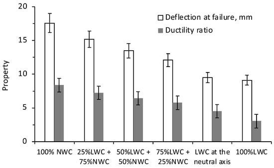 - The incorporation of LWC in the tension zone did not significantly alter the ultimate flexural strength compared to fully cast NWC beams. However, LWC reduced the deflection at failure from 17.6 mm in the NWC beam to 12.1 mm in beam B4 and 9.1 mm in the fully cast LWC beam (B6). This reduction in deflection is accompanied by a notable drop in the ductility ratio, from 8.38 in the NWC beam to 3.03 in the fully LWC beam. While these beams satisfy serviceability requirements, the reduced ductility ratio raises concerns about their performance under overload or extreme loading conditions. Future studies should explore strategies such as incorporating fiber reinforcement or optimizing the mix design to enhance the post-peak behavior and energy dissipation capacity of LWC beams, ensuring their robustness in such scenarios.