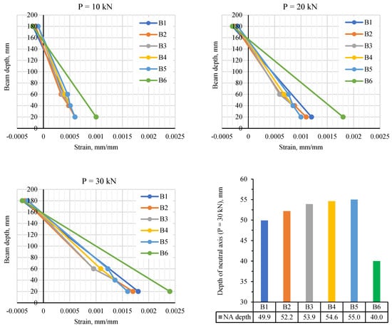 - Beams B1 to B5 exhibited similar strain patterns, with neutral axis positions ranging from 50 to 55 mm. The fully cast LWC beam (B6) showed higher strains, with a recorded value of 0.0024 mm/mm at 30 kN compared to an average of 0.0017 mm/mm for the other beams. The neutral axis in B6 dropped to 40 mm, indicating a significant shift in the structural behavior due to the lower modulus of elasticity.