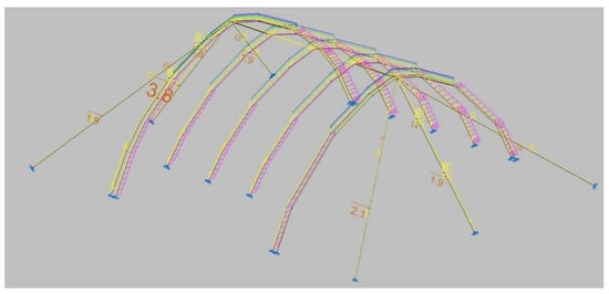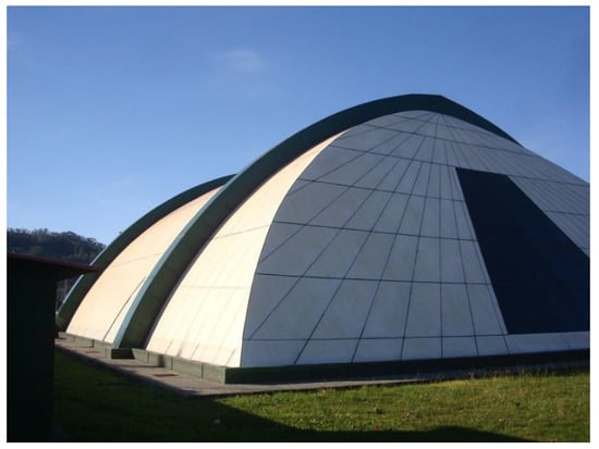 21], considering the roof’s cylindrical shape and the location (Cantabria is located at an altitude of less than 2000 m). Based on the originating causes, loads were classified into dead loads (self-weight), live loads (maintenance), environmental loads (wind and snow), and accidental loads (fire).