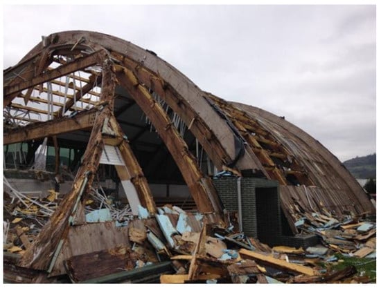 - Munch-Andersen, J.; Dietsch, P. Robustness considerations from failures in two large-span timber roof structures. In Proceedings of the Joint Workshop of COST Actions TU0601 and E55, Ljubljana, Slovenia, 21–22 September 2009. [Google Scholar]