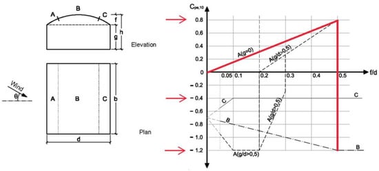 Figure 5, with a pressure wind coefficient of 0.8 in zone A and suction coefficients of −1.2 in zone B and −0.4 in zone C.