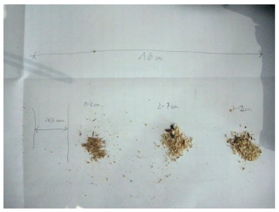 Sawdust extracted from a 16 cm hole drilled at the base of the arch. The depth of each extraction from the 4.3 cm sectional loss is indicated.