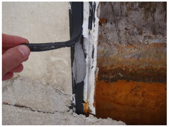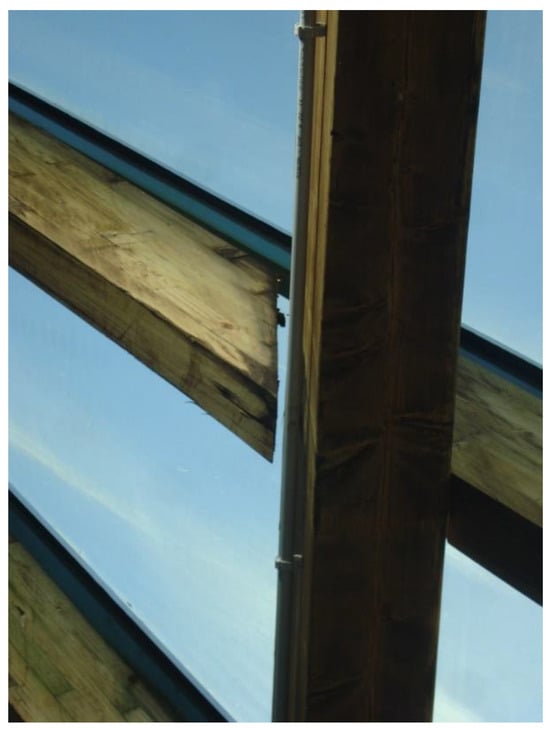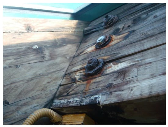 To assess the different constructive elements of the building, a visual inspection was carried out in several parts of the pool. Lower areas of the structure were inspected by demolishing the brick coverings of the supports of the structural elements. Elevated areas of the structure were inspected using a lifting basket. The interior of the timber was inspected by drilling holes with a 10 mm diameter drill bit and extracting timber cores with a 25 mm diameter hollow drill bit. Finally, the roof was inspected. For this process, the false ceiling was dismantled, holes were opened in the wooden sandwich panel, and some panels of the exterior roof were lifted.