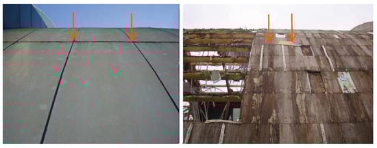 Left of the image: composite roof panels before demolition. Right of the image: the wooden sandwich panel during the demolition process. Red arrows indicate areas of water seepage through the composite roof panels.