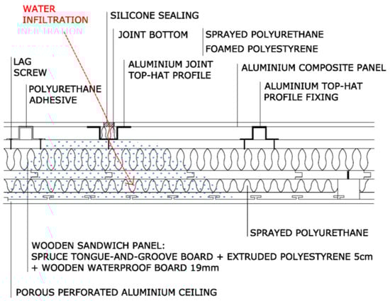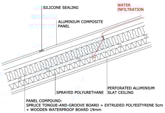 Longitudinal constructive section of the roof with indications indicating its constructive elements and water seepage points.