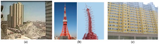 High-rise buildings damage under far-field long-period ground motions: (a) high-rise building collapses in Mexico City earthquake, 1985; (b) Tokyo Tower before and after East Japan earthquake, 2011 []; and (c) high-rise building cracks in Wenchuan earthquake, 2008.