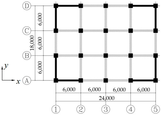 According to the current Chinese code [,,], three RC frame–shear wall structures with 10, 20, and 30 stories, designated as S10, S20, and S30, were designed. The structural plane layout diagram is shown in Figure 2.