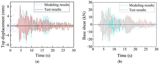 The existing experimental results were used to validate the numerical simulation method. The frame modeling approaches were validated by the one-third-scale RC frame structure shaking-table test by Bracci et al. [,]. Table 2 shows the modal analysis results’ comparison of the simulation results and test results. It can be seen that the simulation error results are all less than 5%, within a satisfactory range for model validation []. Figure 4 shows the time–history results comparison of the top displacement and base shear. It can be observed in the figures that the peak values and their occurrence time are closely aligned.