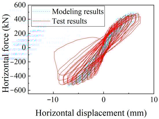 The shear wall modeling approaches were validated using the SW2-1 specimen from the low-cycle repeated shear wall loading tests by Zhang et al. []. Figure 5 shows the comparison of hysteresis curves. It can be observed that the simulation results show a good agreement with the test results in the shape of hysteresis curves and the maximum load-bearing capacity.