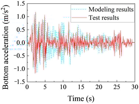 The SSI modeling approaches were validated by the shaking-table test of the regular steel moment-resisting frame considering SSI performed by Li et al. []. The comparison of the bottom acceleration results is shown in Figure 6. The simulation results basically agree with the test results. The peak acceleration during the test was 1.18 m/s2, while the simulation result was 1.157 m/s2, with a small error of 1.93%.