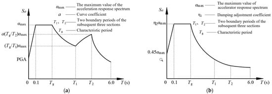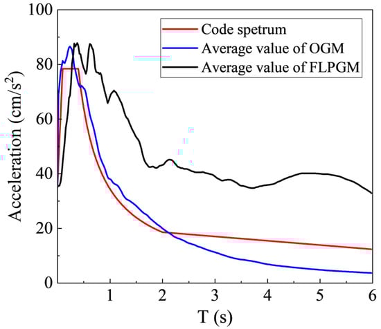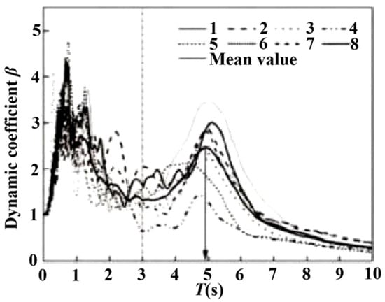 A previous study [] has pointed out that far-field long-period ground motions have a relatively smaller value of PGA but a higher value of PGV, PGD, PGV/PGA, and PGD/PGA than ordinary ground motions, and exhibit long-duration and low-frequency characteristics in their time history. When the structural period exceeds 1 s, the velocity and displacement spectral values of far-field long-period ground motions are higher than those of ordinary ground motions. The acceleration response spectrum of far-field long-period ground motions presents “bimodal characteristics” with a second peak appearing when the period is between 4 s and 7 s [], as shown in Figure 20.