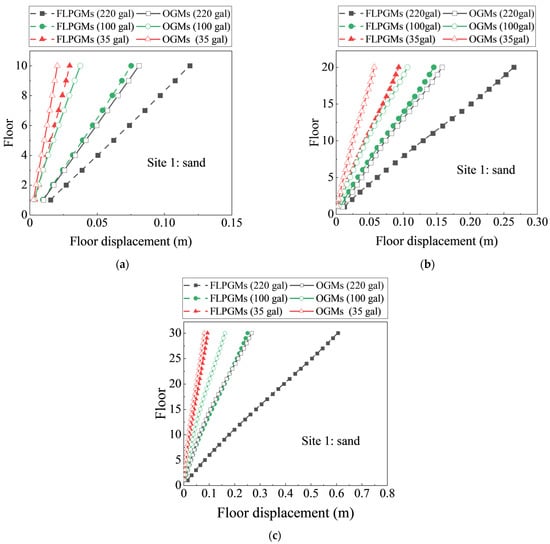 It can be seen in Figure 9 that the floor displacement increases progressively as the PGA increases. For the S20 and S30 structures, the floor displacement at 220 gal is significantly greater than that at other PGA levels. For high-rise building structures, coupling the effect of far-field long-period ground motions and soil–structure interaction, resonance is prone to occur, resulting in the amplification of the displacement. This can be attributed to the low-frequency characteristics of far-field long-period ground motions and the structural period extension considering SSI. Comparing Figure 8 and Figure 9, it can be seen that the SSI effect is more pronounced on loess soil (Site 2) than on sand soil (Site 1). And the displacement amplification is aggravated, especially for the longer-period structures subjected to far-field long-period ground motions with a high PGA.