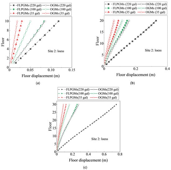 Comparison of structural floor displacement under two types of ground motions for the structures on loess soil (Site 2): (a) S10; (b) S20; and (c) S30.