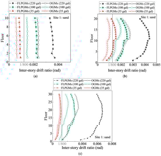 The comparison of the inter-story drift ratio of the structures on sand soil (Site 1) considering SSI under two types of ground motions is shown in Figure 10. According to the China Code [,], the maximum inter-story drift ratio for RC frame–wall structures should not exceed 1/800 and 1/100 when subjected to seismic action with a PGA of 35 gal and 220 gal, respectively, corresponding to the seismic precautionary objectives of “no-damage” and “no-collapse.” The limitation is indicated in Figure 10.