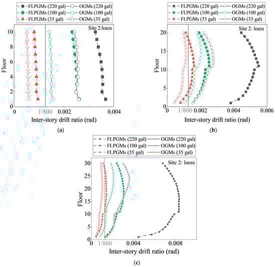Comparison of inter-story drift ratio under two types of ground motions for the structures on loess soil (Site 2): (a) S10; (b) S20; and (c) S30.