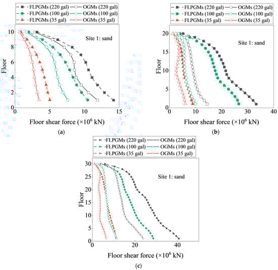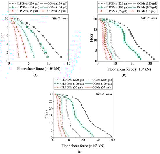 Comparison of structural floor shear force under two types of ground motions for the structures on loess soil (Site 2): (a) S10; (b) S20; and (c) S30.