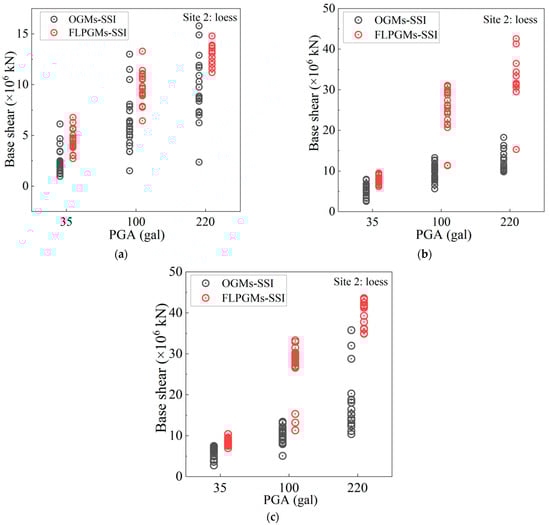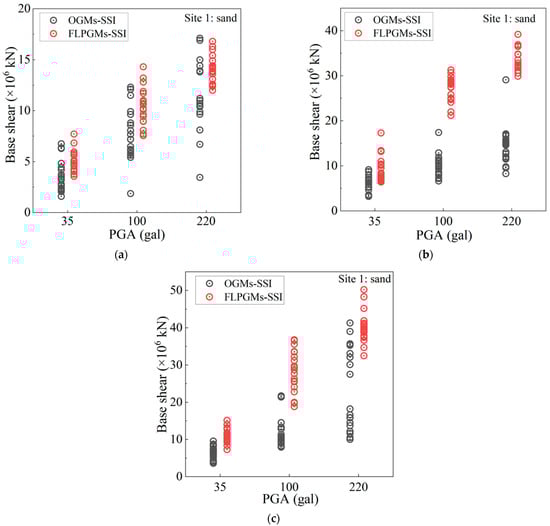 The base shear response of the structures on sand soil considering SSI under 20 OGMs and 20 FLPGMs is compared in Figure 14.