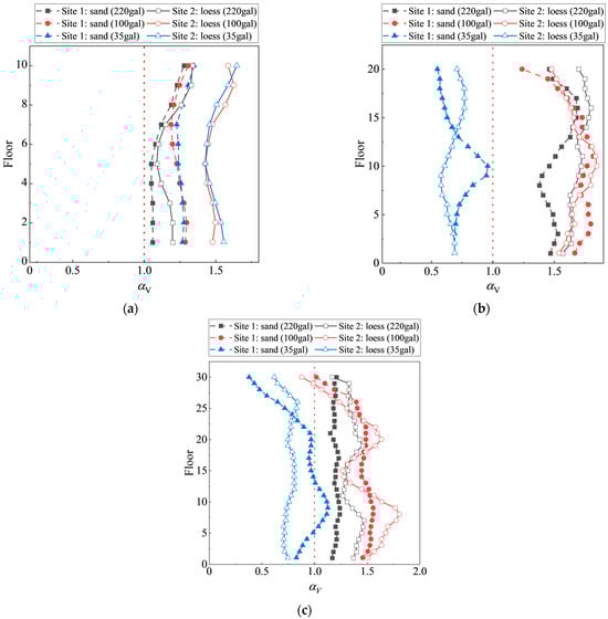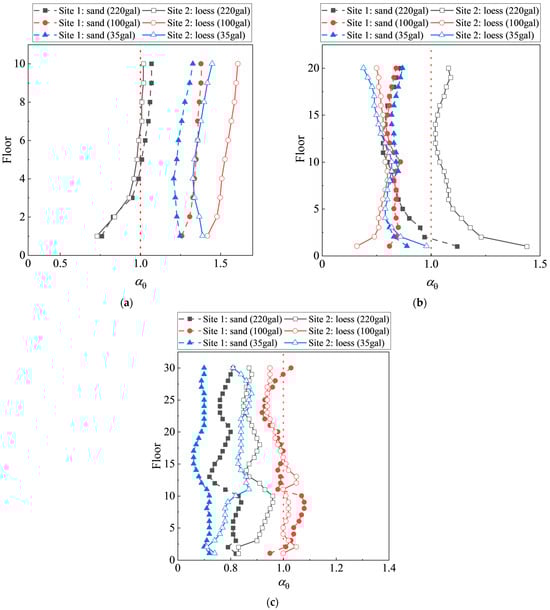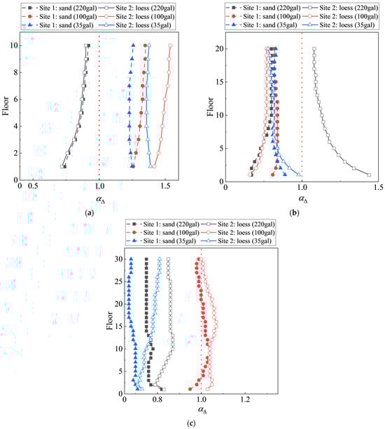 It can be seen that, for the structures with different periods, the SSI influence coefficient presents various trends under different PGA levels. For the S10 structure, the SSI coefficient at 35 gal is less than 1, while that at 100 gal and 220 gal is both larger than 1. For the S20 structure on loess soil (Site 2), when the PGA is 220 gal, the SSI influence coefficient of the floor displacement is remarkably greater than 1. A similar phenomenon occurred at a PGA of 100 gal for the S30 structures. In this case, the SSI effect under far-field ground motions is more aggravated than that under ordinary ground motions. The SSI influence coefficient on Site 2 is noticeably larger than that on Site 1, highlighting the significant impact of the foundation soil type on the SSI effect.