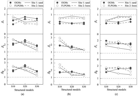SSI influence coefficient of floor displacement under two types of site condition: (a) S10; (b) S20; and (c) S30.