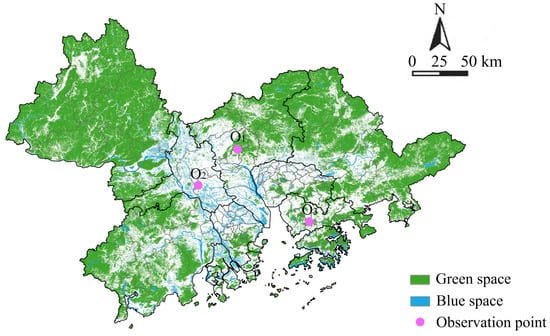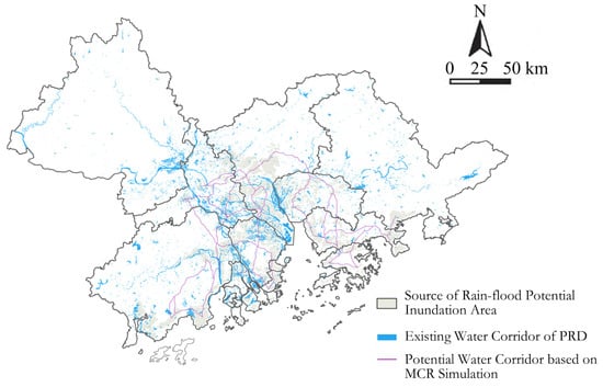 Blue-green space encompasses various natural elements such as rivers, lakes, mulberry ponds, wetlands, woodlands, grasslands, and urban green spaces [,]. Over the course of its long evolutionary history, the Pearl River Delta (PRD) in China has developed a vast expanse of blue-green space characterized by large-scale coverage, high density and diverse composition. In fact, blue-green space area accounts for 74.8% of the region’s total land area of the PRD and is the most densely water-networked space in China []. Blue-green space is not only crucial for achieving rainstorm reduction and the purification of water, but also serves as the foundation for the provision of ecosystem services and promotion of biodiversity. It is of special importance to the rain-flood resilience of PRD in collaboration with grey infrastructure such as levees, dams, and municipal pipe networks. However, since the 1980s, the rapid urban development in the PRD has led to the degradation of forested areas, grasslands and mulberry, etc. [,,], which has resulted in the fragmentation of large-scale interconnected blue-green space. Parts of blue-green space have been destroyed during events such as the fragmentation of high-value wetlands and the decrease of mangrove natural shoreline and beach land in the PRD. The fundamental role of blue-green space in mitigating rain-flood disturbance has long been weakened, which has led to the exacerbation of the diversity, frequency and destructiveness of rain and flood damages in the PRD.