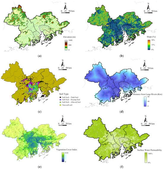 Blue-green spatial analysis of PRD: (a) Elevation; (b) Slope; (c) Type of Soil; (d) Distance from Large Rivers; (e) Vegetation Cover Index; (f) Surface Water Permeability.