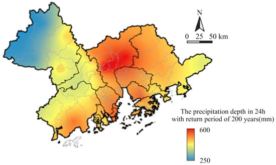 The distribution of precipitation depth in 24 h with return period of 200 years in PRD.