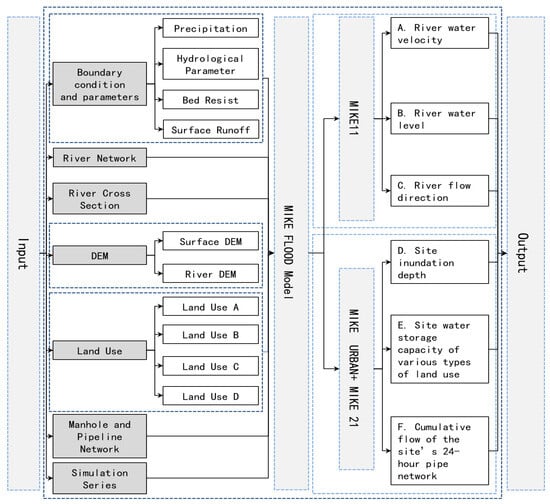 This study applies MIKE Flood model to project potential inundation areas in the PRD under multi-scenarios of rain-flood disturbances. The MIKE Flood model has been widely used in the simulation of rain and flood damage because of its powerful function. For example, scholars such as Tansar [], Hlodversdottir [] and Ramteke [] all applied the MIKE Flood model to simulate and analyze rain-flood affected areas. The MIKE Flood model is shown in Figure 4.