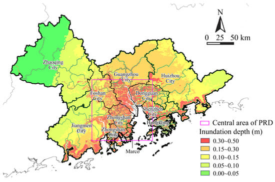 Potential inundation areas and corresponding depth in PRD under combined rain-flood damage.