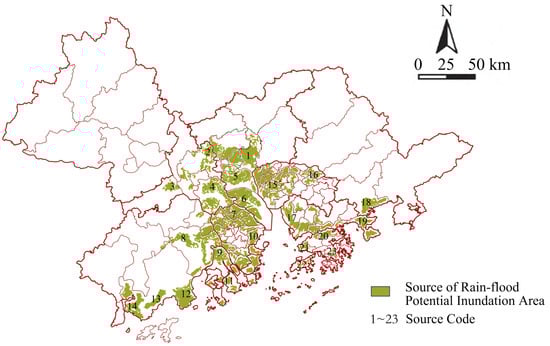 Urbanization has caused cities within the PRD to be more susceptible to erosion caused by climate change compared to other regions [,,]. Over the past three decades, the PRD has witnessed six significant rain-flood disasters occurring in 1994, 1998, 2008, 2010, 2018 and 2023. These calamities have resulted in extensive building collapses and widespread inundation of agricultural lands as well as human settlements [,,]. For instance, during July 1994, river floods occurred in both Xijiang River and Beijiang River and led to an average inundation depth exceeding one meter in some streets of Zhongshan City, Guangzhou City and surrounding regions, as well as causing direct economic losses surpassing CNY two billion. In August 2010, an extended period of heavy precipitation triggered severe urban waterlogging across eight districts of Guangzhou City resulting in traffic congestion and shop inundation. In September 2018, Typhoon “Shanzhu” breached multiple dikes within the PRD causing extensive flooding of agricultural lands along with human settlements. In September 2023, cumulative precipitation exceeding a 600-mm depth was recorded along the southern coast of the PRD within a span of twenty-four hours [].