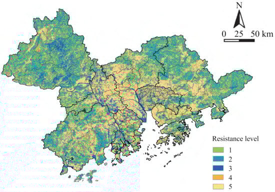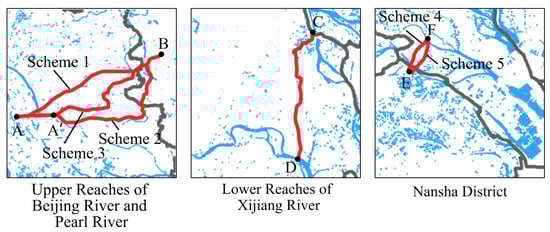 Firstly, large potential inundation blocks with a depth of more than 0.30 m and simultaneously with more than 50 km2 under multi-scenario rain and flood damage in the PRD are selected as the source area from the perspective of “source-sink-flow” (Figure 7). Secondly, resistance factors including elevation, slope, type of soil, distance from large rivers, vegetation cover index and surface water permeability are selected by assigning 5-level values (Table 1). Thirdly, based on expert scores and the analytic hierarchy process (AHP), the weights of resistance factors are determined: elevation (0.1), slope (0.15), type of soil (0.2), distance from large rivers (0.15), vegetation cover index (0.15), surface water permeability (0.1) and population density (0.15). Fourthly, based on formula (3) and combined with the natural breakpoint method, the resistance level surface for water corridors is formed (Figure 8). Fifthly, potential water corridors are developed based on the MCR model by utilizing ArcGIS (Figure 9). Sixthly, the comparative analyses of candidate Schemes 1 to 5 (Figure 10) are conducted by regarding their respective advantages and disadvantages (Table 2 and Table 3).