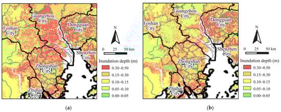 Potential inundation areas and corresponding depth in the central area of PRD: (a) Before optimizing blue-green space; (b) After optimizing blue-green space.