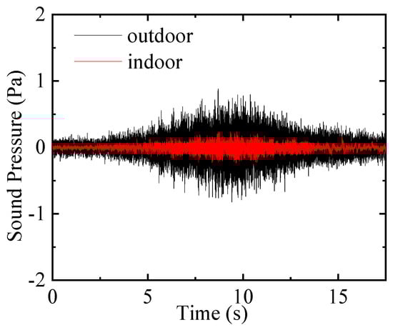Long-term continuous monitoring was conducted to capture the complete process of sound pressure variation during train passage. The representative time series of sound pressure recorded by indoor and outdoor microphones during the train passage are shown in Figure 2.