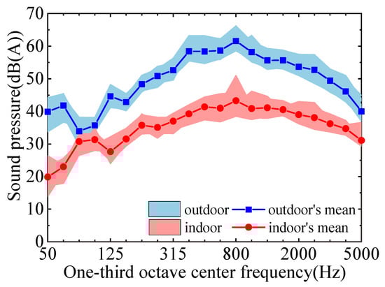 As the train passes, there is a significant increase in sound pressure, and a distinct spindle-shaped waveform can be observed in the time history curve, with outdoor sound pressure notably exceeding indoor sound pressure. The sound pressure time history is further analyzed in the 1/3 octave frequency band and processed using the A-weighted network. In accordance with the testing specifications, the analysis frequency band covers 18 center frequencies ranging from 100 Hz to 5000 Hz []. Figure 3 illustrates the sound pressure levels in the one-third octave frequency band for both outdoor and indoor test points of the building during multiple train passages (exceeding 20 trains). The test results are presented as envelope curves, along with their corresponding mean values.