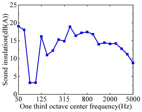 Utilizing the measured average sound pressure level curves for both indoor and outdoor environments, the difference between these two can be calculated to determine the sound insulation (or sound transmission loss) of the building, as illustrated in Figure 4. Analysis of the sound insulation curve reveals that the sound insulation of the building is not uniformly distributed across the frequency spectrum. The sound insulation ranges from 3 to 22 dB for frequencies from 50 Hz to 5000 Hz, exhibiting a peak in the low-frequency band below 60 Hz, with minimal sound insulation capacity observed between 80 Hz and 100 Hz. In contrast, there is a gradual increase in sound insulation capacity from 125 Hz to 800 Hz, followed by a gradual decrease from 1000 Hz to 5000 Hz.