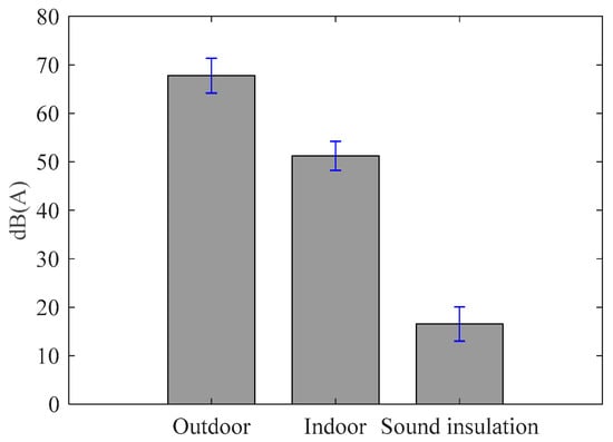 (1) Sound insulation performance of individual building components, using either the finite element method or laboratory testing of specific wall structures and window assemblies [,,,,]. For example, Granzotto et al. [] systematically studied the influence of glass frame, glass thickness, and the presence of PVB on the sound insulation performance of windows using the sound laboratory testing protocol; Wu et al. [] studied the sound insulation characteristics of several lightweight partition walls by employing both laboratory testing and finite element methods; Zhu et al. [] investigated the influence of glass thickness and air layer thickness on the sound insulation performance of double-glazed windows using COMSOL finite element software. Liu et al. [] tested the sound insulation performance and mechanical properties of medium density fiberboard (MDF) and rubber multilayer panels. The weighted sound reduction was 28.0 dB for 6 mm MDF, while it was 37.4 dB for 6 mm wood composite damping material, an increase of 25.1%. Wang et al. [] investigated the influence factors on the impact sound insulation performance of floor lining type, thickness, mass density and dynamic stiffness of elastic material, and the quality and thickness of floating plates.