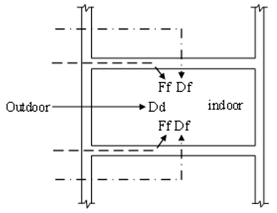 (2) Only the direct sound transmission of the building facade is considered and the lateral sound transmission loss from adjacent walls is ignored. Figure 6 illustrates a schematic view of the transmission paths for outdoor noise entering indoor spaces. Dd denotes the direct sound transmission path, while Ff and Df indicate lateral sound transmission paths. In comparison to lateral sound transmission, direct sound transmission predominates; thus, the acoustic insulation performance of the exterior wall directly affects the overall sound insulation performance of the building.