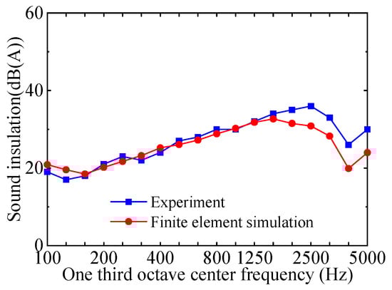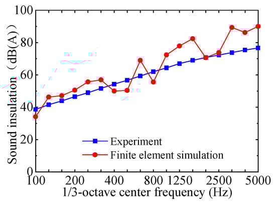 First, sound–structure coupling calculations were conducted on the individual window and wall element to obtain its sound insulation curves. These calculated curves were then compared against those obtained from lab tests in a reverberation-absorption chamber. Figure 9 and Figure 10 give comparative results for the calculated and experimental values of sound insulation performance for the single-layer glass window and concrete wall components, respectively.