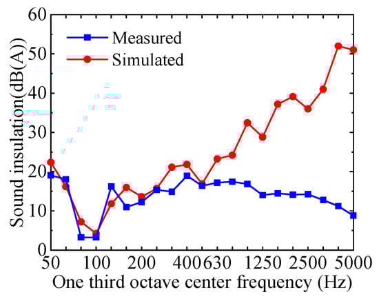 The sound–vibration coupling simulations were conducted on the window-wall assembly model, with results compared against measured values as illustrated in Figure 12.