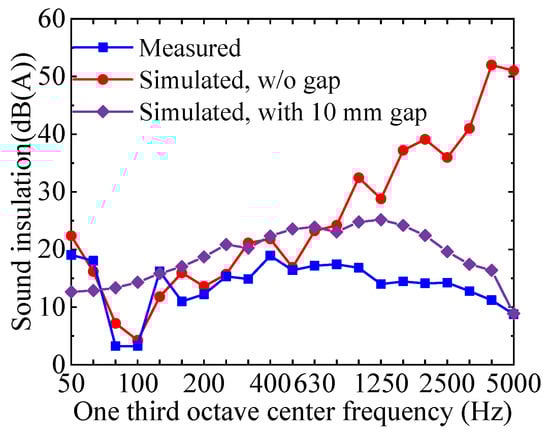 Figure 14 shows a comparison between the calculated and measured sound insulation performance of the window-wall assembly model with a gap. Compared to the gapless condition, the sound insulation performance in the frequency band above 630 Hz decreases significantly, and it is more consistent with the measured results. The sound insulation valley in the frequency band of 80 Hz to 100 Hz disappears, and the overall trend of the curve becomes smoother. The overall calculated sound insulation performance is still greater than the measured value, mainly because the lateral sound transmission effect is ignored in the theoretical model.
