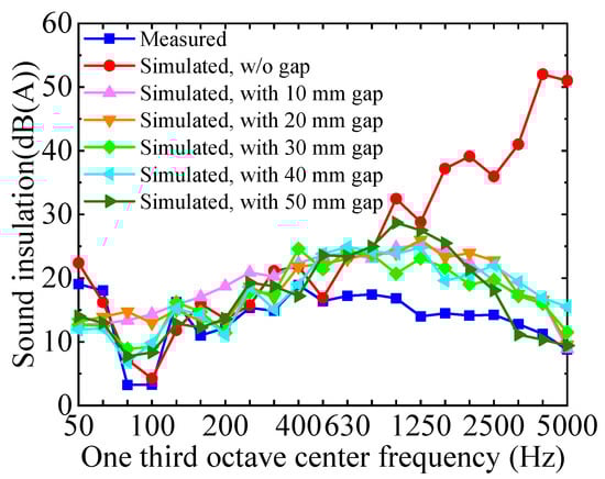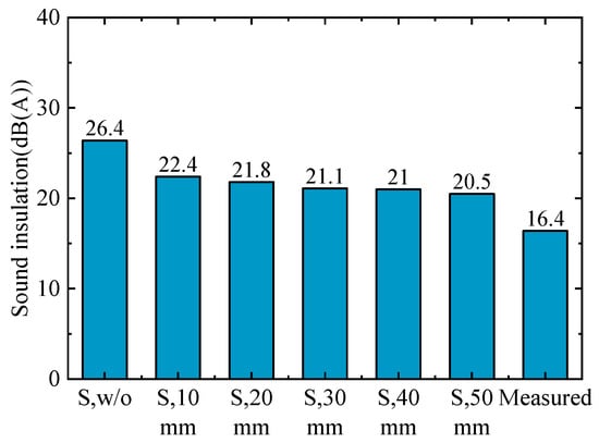 The sound insulation amount generally decreases with the increase in gap width; however, the rate of change varies. The most pronounced reduction in sound insulation occurs when transitioning from no gap to a 10 mm gap, resulting in a decrease of 4 dB (A), whereas at a 50 mm gap, the reduction is approximately 6 dB (A). Notably, there is no obvious pattern regarding sound insulation across different gap widths. Furthermore, the calculated sound insulation values for various gap widths remain higher than the measured ones, probably due to the omission of lateral sound transmission effects in the theoretical model.